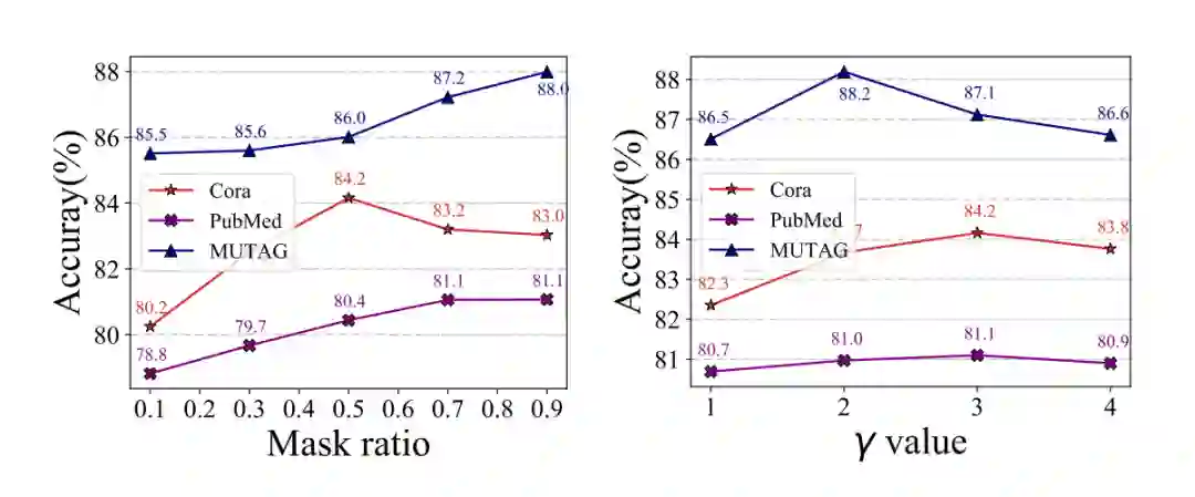 图 2 遮蔽率(mask ratio)的影响。在大多数情况下,低遮蔽率的表现并不好,且最佳的遮蔽率在不同的图(graph)中是不一样的。