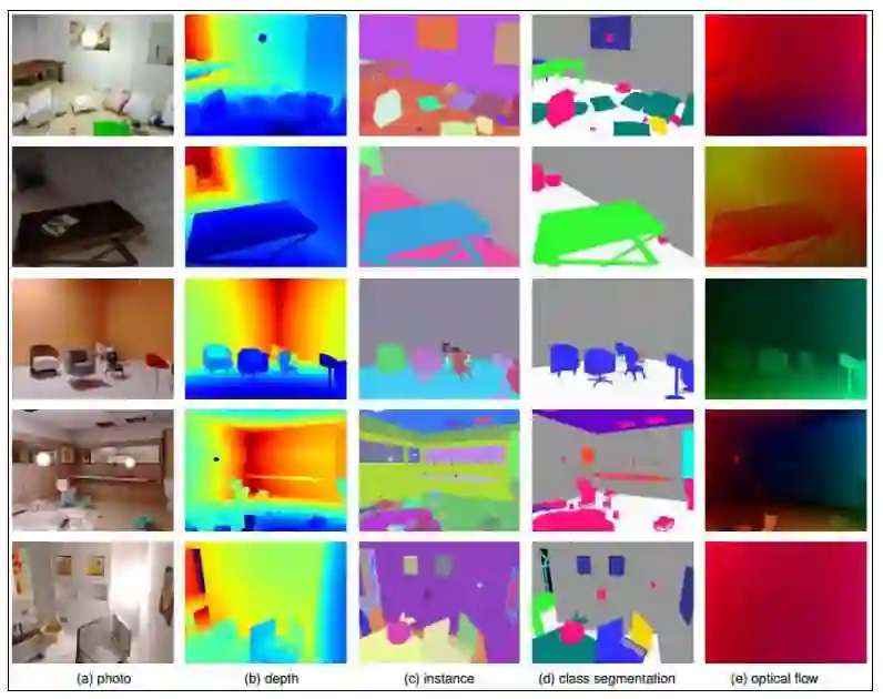 图 18:SceneNet RGB-D 示例。来自 SceneNet RGB-D 的示例,它是一个带有 500 万张真实感图像的合成室内轨迹的真值数据集。图片 (a) 通过计算图呈现,带有从 (b) 到 (e) 的特定任务的可用真值。合成数据集的创建有助于域适应进程,如果从其中学习到的知识无法应用到现实世界,那么合成数据集则是无意义的。这正是域适应发挥作用的地方,它具备把知识从一个领域迁移到另一个领域的能力,比如从合成图像到现实世界。域适应最近再次迅速发展,其在迁移学习方面的努力是亮点。列 (c) vs (d) 展示了实例与语义/分类分割之间的不同。来源:McCormac et al. (2017) [174]