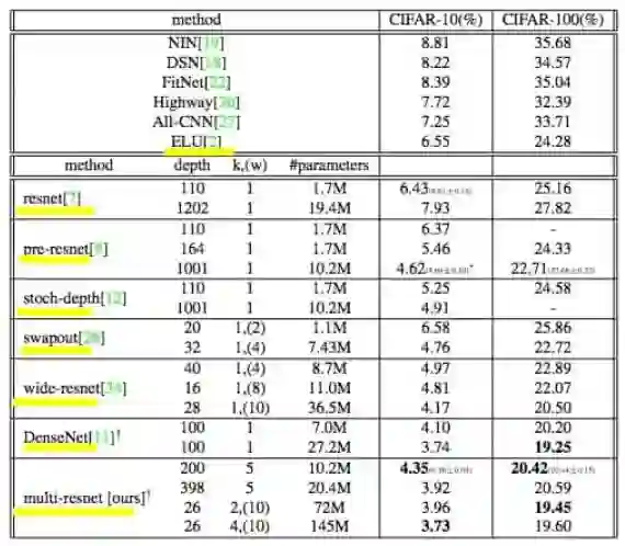 Multi-Residual Networks: Improving the Speed and Accuracy of Residual Networks [158]:再次提倡 ResNet 的集成,支持 ResNet 架构变得更宽、更深。「multi-residual network 增加了残差块中残差函数的数量。」提高的准确率使网络在 CIFAR-10 和 CIFAR-100 数据集上的误差分别是 3.73% 和 19.45%。