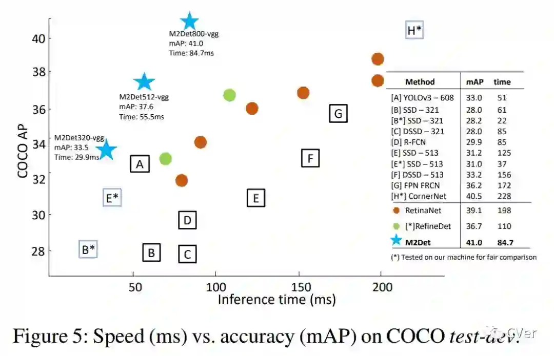 在MS-COCO benchmark上,M2Det的单尺度版本和多尺度版本AP分别达到41.0和44.2