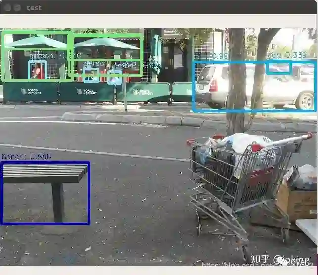 测试中其中一张图片检测效果如下;终端打印出目标物的坐标,id,置信度等信息;
