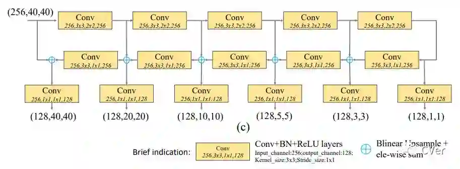 SSD型:使用了主干网络的最后两层,再加上4个使用stride=2卷积的下采样层构成;(特征融合太少)