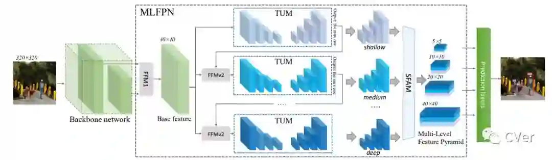 M2Det使用主干网络+MLFPN来提取图像特征,然后采用类似SSD的方式预测密集的包围框和类别得分,通过NMS得到最后的检测结果。