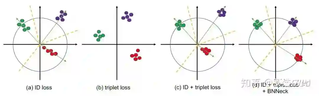 这是这篇文章的核心点。我们常用的Baseline通常会同时使用ID损失和triplet损失一起优化同一个feature。但是在大量前置的研究发现,分类损失其实是在特征空间学习几个超平面,把不同类别的特征分配到不同的子空间里面。并且从人脸的SphereFace [4]到ReID的SphereReID [5]等工作都显示,把特征归一化到超球面,然后再优化分类损失会更好。triplet loss适合在自由的欧式空间里约束。我们经常观察到,如果把feature归一化到超球面上然后再用triplet loss优化网络的话,通常性能会比不约束的时候要差。我们推断是因为,如果把特征约束到超球面上,特征分布的自由区域会大大减小,triplet loss把正负样本对推开的难度增加。而对于分类超平面,如果把特征约束到超球面上,分类超平面还是比较清晰的。对于标准的Baseline,一个可能发生的现象是,ID loss和triplet loss不会同步收敛。通常会发现一个loss一直收敛下降,另外一个loss在某个阶段会出现先增大再下降的现象。也就是说这两个task在更新的过程中梯度方向可能不一致。但是由于最终都能够收敛,所以可能容易引起大家的忽视,我相信应该不只是我们观察到过这个现象。