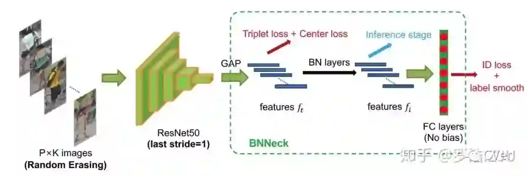 基于以上现象考虑,我们希望找个一种方式,使得triplet loss能够在自由的欧式空间里约束feature,而ID loss可以在一个超球面附近约束feature,于是乎就出现了以下的BNNeck。BNNeck的原理也很简单,网络global pooling得到的feature是在欧式空间里的,我们直接连接triplet loss,我们把这个feature记作 。然后这个feature经过一个BN层得到