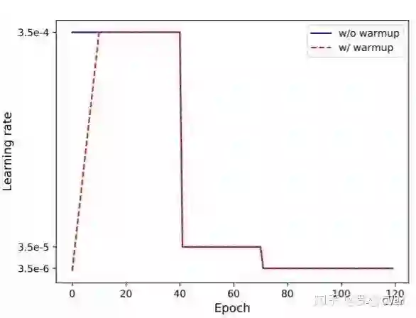Warmup学习率并不是一个新颖的东西, 在很多task上面都被证明是有效的,在我们之前的工作[1]中也有过验证。标准Baseline使用是的常见阶梯下降型学习率,初始学习率为3.5e-4,总共训,120个epoch,在第40和70个epoch进行学习率下降。用一个很大的学习率初始化网路可能使得网络震荡到一个次优空间,因为网络初期的梯度是很大的。Warmup的策略就是初期用一个逐渐递增的学习率去初始化网络,渐渐初始化到一个更优的搜索空间。本文使用最简单的线性策略,即前10个epoch学习从0逐渐增加到初始学习率。