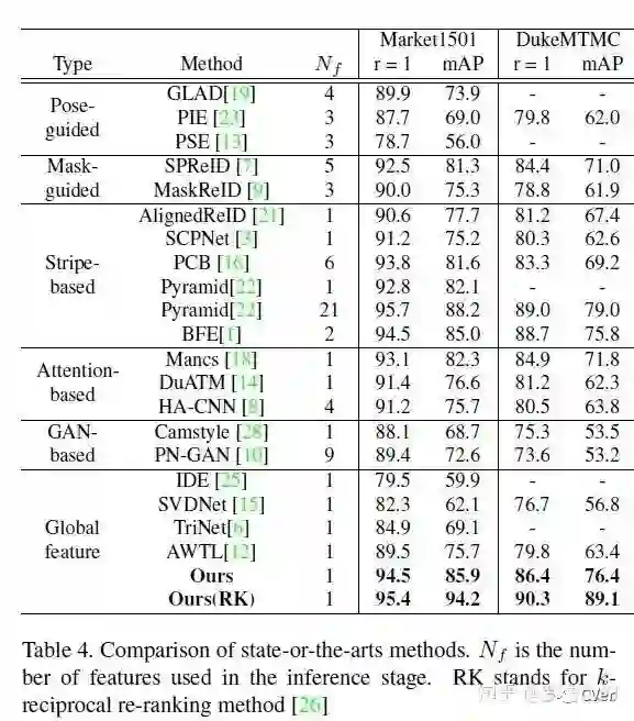 通过引入前文的各种trick,我们的Modified Baseline就如上图所示。输入的图像经过REA数据增广,然后经过ResNet50网络,last stride改为1。然后经过BNNeck,由于center loss也是一种metric loss,所以和triplet loss一起放到BN前面。最后分类损失结合LS一起计算。整个网络使用warm up学习率去优化。