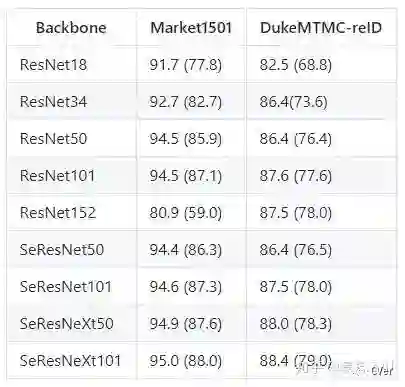 在我们开源了代码之后,有好心人帮我们扩展了Backbone,包括ResNet、SENet、SeResNet等等。大致结果呈现网络越深,效果越好,这也符合正常的结论。其中SeResNeXt101取得了95%的rank1和88%的mAP,基本已经相当高了。ResNet152在Market1501上有点反人类,可能是数据集太小,并且比较简单,所以overfit了吧。