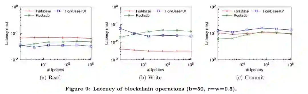 在这些扫描操作中,ForkBase显示出最大的性能优势。如果我们考虑延迟和吞吐量,基于ForkBase的Hyperledger实现和基于Rocksdb的Hyperledger实现非常接近。(下图中的ForkBase-KV是Hyperledger使用ForkBase作为纯粹的键值存储系统,并没有充分利用任何高级功能)。