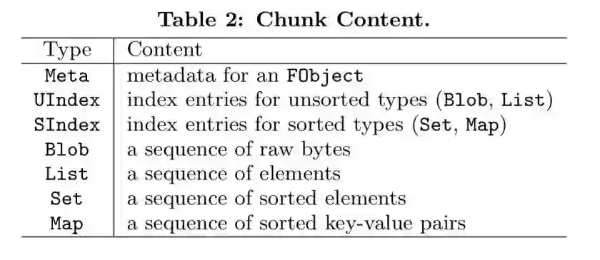 ForkBase选择了在块级进行基于内容的重复数据删除。与文件系统中使用的类似技术相比,ForkBase使用更小的块和可感知数据结构的分块策略。比如说,一个列表只会在元素边界处被拆分,那样根本不需要用多个块来重构列表项。ForkBase可识别许多不同类型的块,每种类型的块都由cid作为独特的标识,cid就是块内容的哈希。