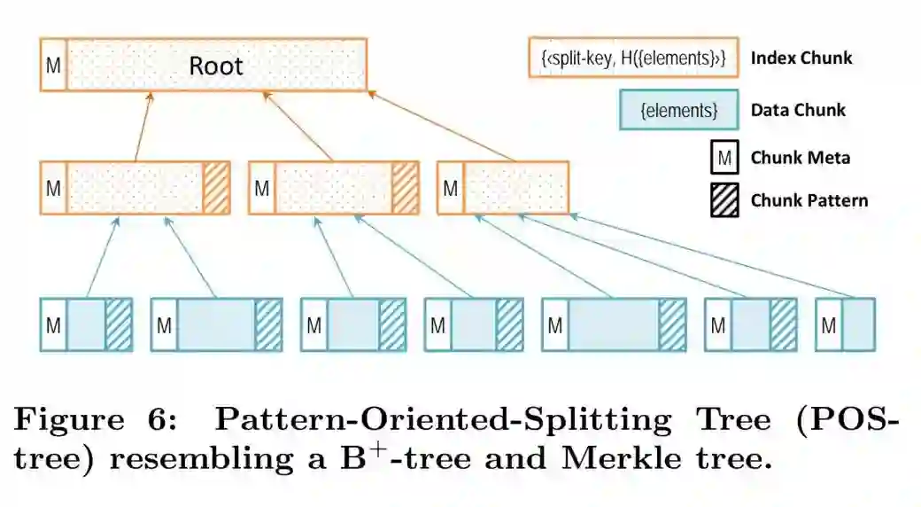 其结构受到基于内容的分片的启发,酷似B+-tree和默克尔树的组合。在POS树中,节点(即块)边界被定义为通过对象内容来检测的模式。具体来说,想构建一个节点,我们会从头开始扫描,直到一个预定义模式出现,然后创建新节点来保存扫描的内容。由于叶节点和内部节点的随机性程度不一样,我们为它们定义了不同的模式。