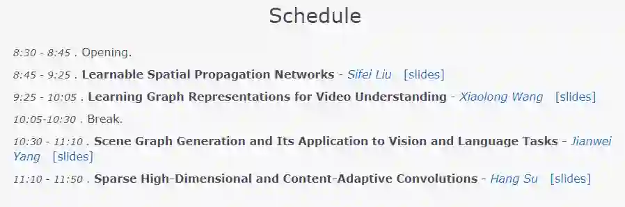 讲者:Sifei Liu, Varun Jampani, Xiaolong Wang , Dhruv Batra, Abhinav Gupta, Jan Kautz, Ming-Hsuan Yang