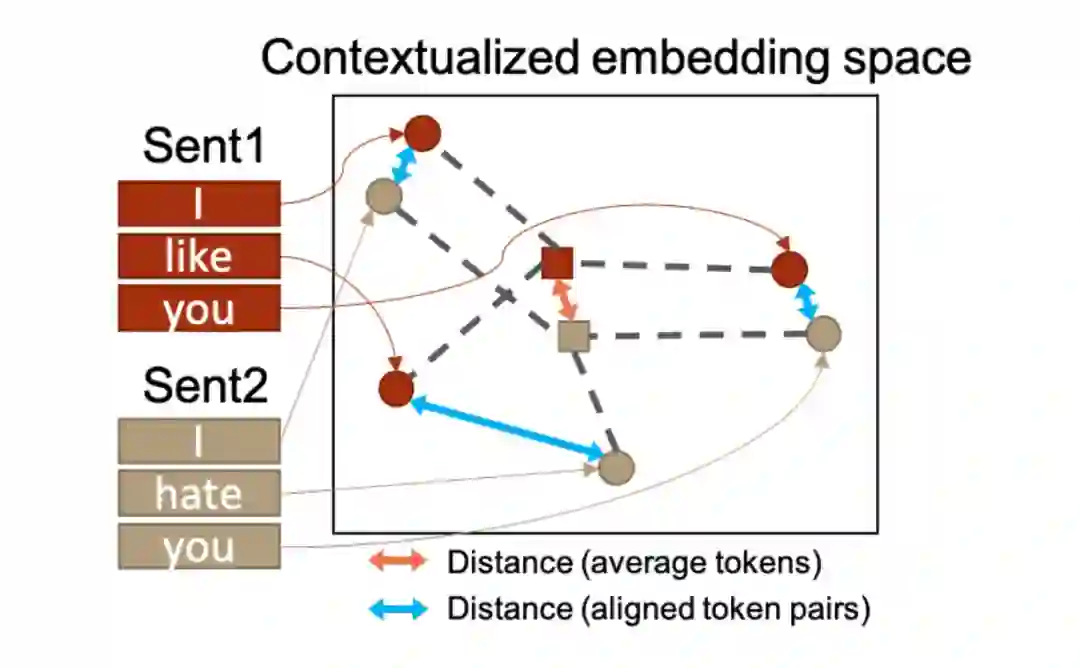 2. 目前的方法采用平均 token embedding 得到句子表示,用于计算句子相似性,这是 sentence-level 层面的建模,无法从 token-level 层面显式地融合语义对齐的 token pairs 之间的距离。