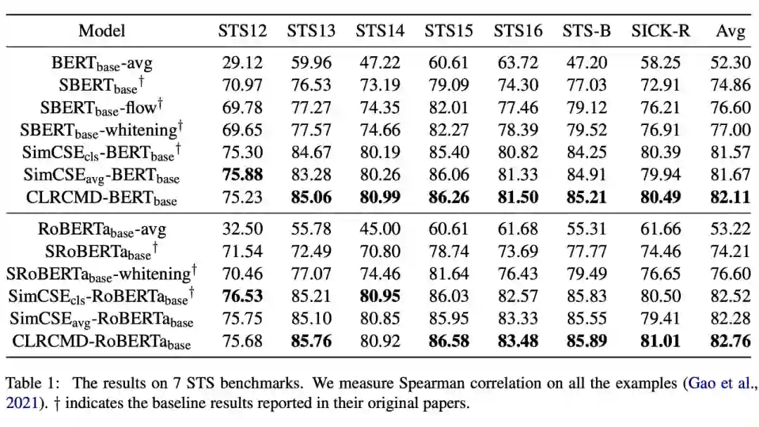 2. CLRCMD 直接将句子对的相关性提炼成语义对齐的标记对的相关性。从这个意义上说,我们的上下文嵌入空间有效地从训练句子对中捕获了标记级的语义相关性,从而为其句子相似性提供了更好的解释。