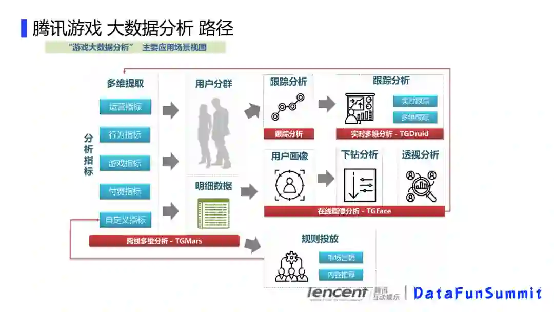 我们游戏大数据分析的一个主要应用场景是这样的,首先你可能会有一些分析指标,比如用户的行为指标,我们的活跃,付费,新增,或者是游戏内的对局情况,比如对局数,杀人数之类的,基于这些指标我们可以对用户进行分群,比如我们通过对付费额度的一个区间划分,可以有大R,中R和小R用户,比如大R用户一般是付费能力比较高的用户,也是游戏的重点用户,还有高活跃用户,比如最近一周登录次数达到一定程度。当然,你也可以是定义的一些流失付费用户,或者自己上传的用户,然后拿到这些用户,可以进行跟踪分析,比如看下这批付费流失的用户在流失前的游戏行为,这些用户的对局情况,或者是副本参与情况。这样就有助于流失用户的分析。也可以对这批用户进行画像分析,看下这些用户的一些年龄占比、性别、省份区域等,还可以对某些感兴趣的用户发起营销活动,然后这些他投放的用户又可以和自定义指标关联。对这批用户实时跟踪游戏内的表现,比如实时观察这批用户的当天在线时长区间,游戏内某些特定场景的表现情况比如对局情况、副本参与情况等。这样对营销的数据就可以及时了解到,从而形成一个数据闭环。