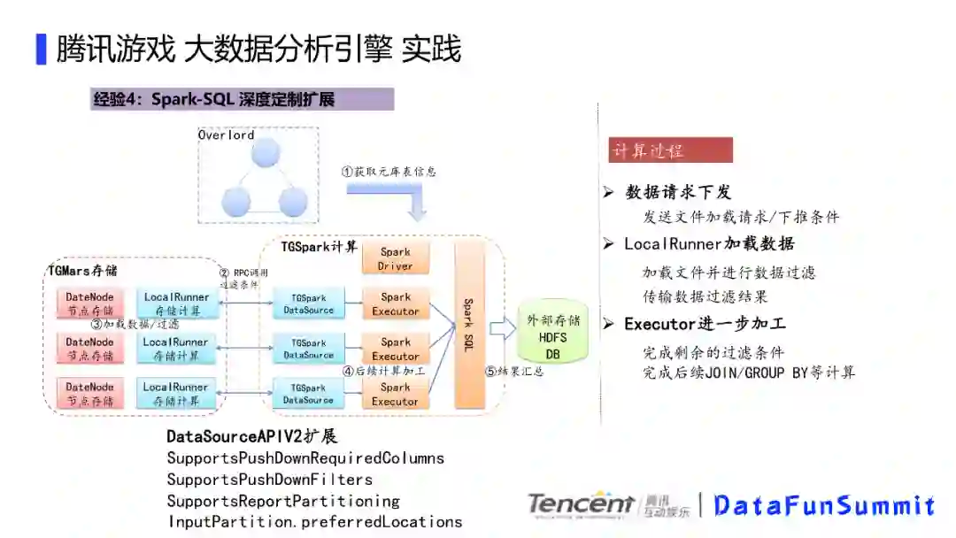 Spark-SQL深度定制扩展,主要是通过对DataSourceAPIV2扩展。计算过程包括,数据请求进行下推,本地加载文件并进行数据过滤,最后进一步加工。