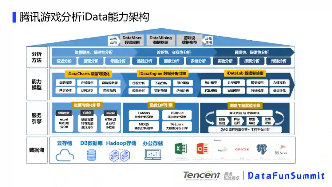 从底向上分别是数据湖,我们有云存储,常见db数据库,比如mysql,pg库等,还有hadoop存储以及办公存储。上一层是服务引擎,主要有数据可视化引擎,支撑上游的可视化服务,我们的数据分析引擎,支撑我们多维、实时以及大数据分析,还有我们的工程试验引擎支持ai方面的一些研究。在上一层是能力模型,主要是一些功能能力的提炼,再上一层是分析方法以及决策运用,具体到就是用户层面接触的东西,今天我主要会讲解数据分析引擎这一块的内容。也就是腾讯游戏大数据分析引擎的实践
