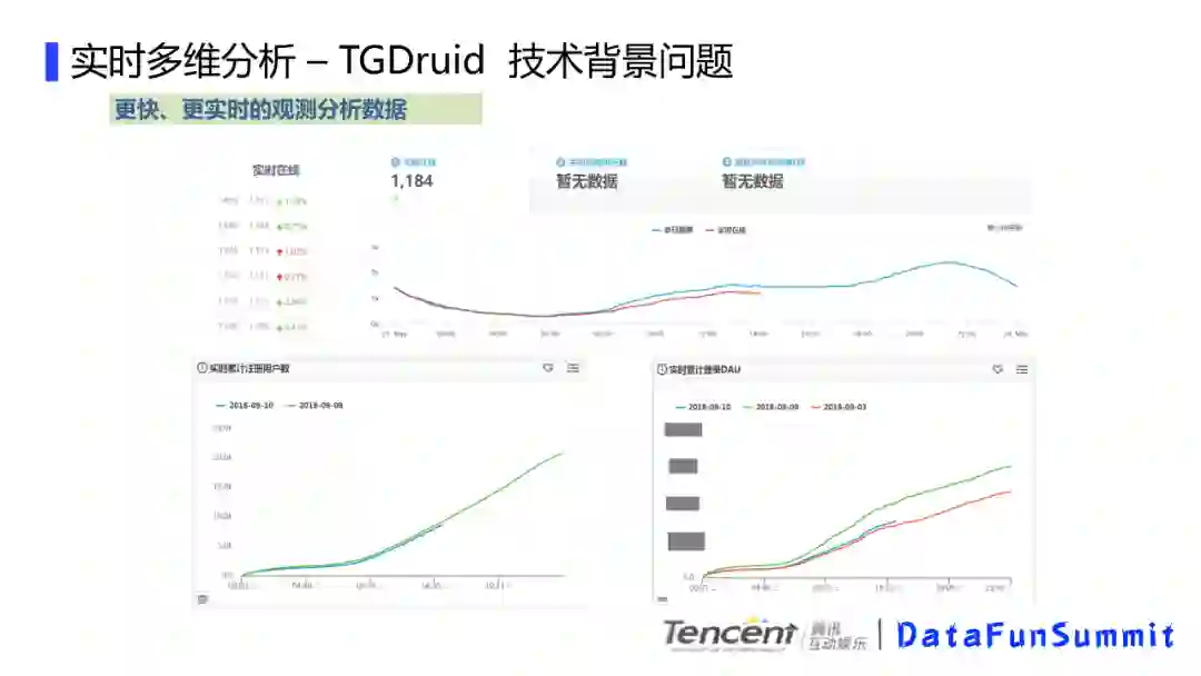 我们先看下实时多维分析的技术背景,其中一个述求就是要更快更实时的观测分析数据,比如我们的实时在线,实时创建角色数,实时DAU,实时收入,这些数据尤其是在新游戏刚刚上线,或者有活动节点的时候会比较关心。我们前面说到的一般是按照游戏整体玩家用户来看的,而另外一个述求是针对某个用户群体的一个实时数据跟踪,比如我们观察注册用户在当天的用户在线时长分布,或者针对大R用户的观察当天对局或者副本相关的实时表现,这些对也是精细化运营的一个述求。或者,我们通过实时在线或者充值,能对当天的整体数据进行实时预测,通过和目标进行对比,方便进行相关的运营决策。这些都需要涉及到实时多维分析的相关技术。