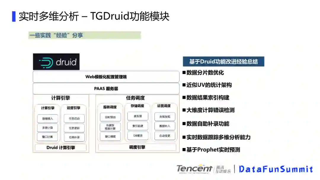 我们主要还是基于开源的那套来做,改造不是特别多,我们主要是在配置化上下功夫,不需要开发,简单的配置就可以实现实时多维计算,通过web配置可以直接启动任务的etl和调度任务,保证数据的快速接入。目前我们的接入一般在5分钟内完成,就是说,如果你需要看某个感兴趣的用户包,只需要再我们的web端配置下就好了。我们的计算引擎提供了很多服务,数据接入,任务启动更新补录等,我们的调度引擎,支持表发现,自助的维度创建,窗口调整,自动失败发现,数据补入等功能。这里有些经验和大家分享,一个是druid的数据分片的优化,我们有些数据比如天累积的用的是天分区,固定窗口的计算用的是小时分区,根据场景来调配,整体的资源消耗会有一些降低。主要是druid 的分区间的交换是有时间缓冲的,会导致时间缓冲内的内存消耗是翻倍的。我们有大维度计算错误检查,这里主要是有些数据接入的时候,如果配置错了,把对象当成了维度,数据就发散的特别厉害,这样会很容易造成OOM,这块我们接入的时候添加数据探测,这种情况会做一个提示。还有数据补录,实时计算一般是有时间窗口的,比如我们10分钟后到的数据会被舍弃,数据的晚到会导致数据统计不正确,我们提供了自助补录,可以把web下发任务重跑。以及后面的基于Prophet的实时预测,主要是基于当前实时数据,预测当天结束时间点的数据,给运营提供参考。