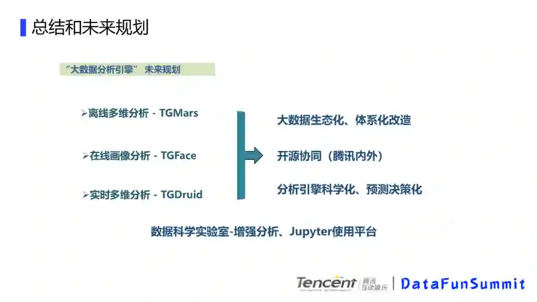 我们后续的一个规划是这样的,基于这三个引擎,我们进行大数据生态化和体系化改造,然后进行开源协同,再分析引擎科学化和预测决策化上下功夫,同时数据科学实验室部分我们目前也投入到增强分析和jupyter平台的一些开发中。希望在科学实验室上有些数据落地。