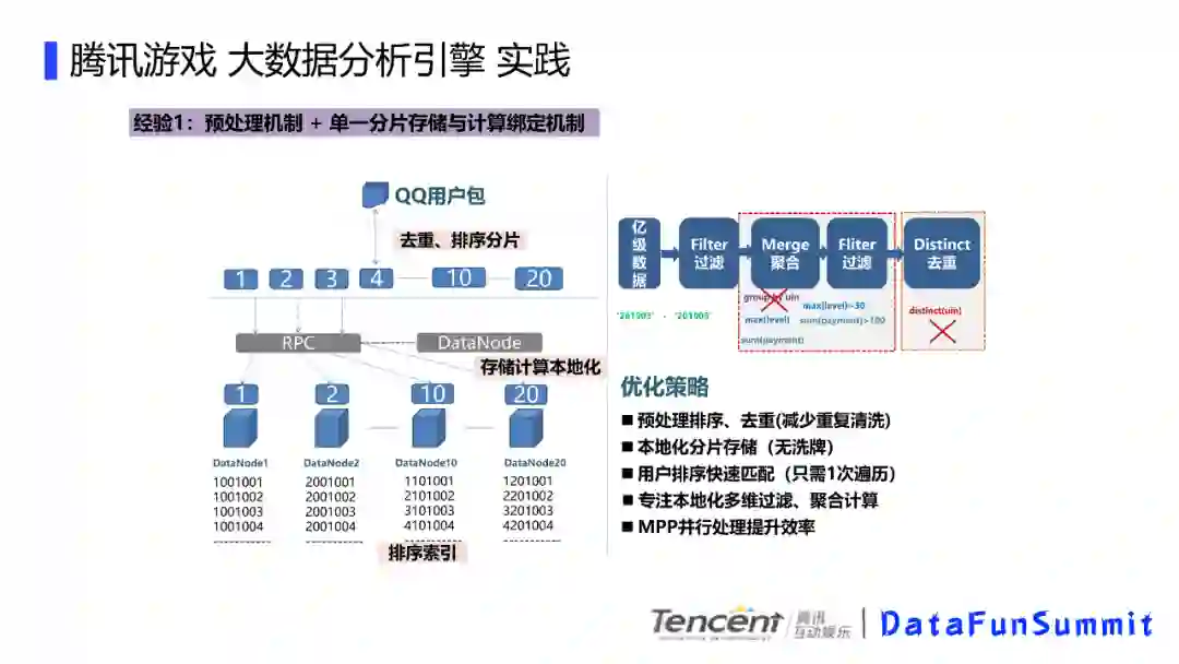 预处理机制+单一分片存储与计算绑定机制。优化策略就是先进行预处理排序,去重(减少重复清洗);本地化分片存储(无洗牌);用户排序快速匹配(只需一次遍历);专注本地化多维过滤,融合计算;MPP并行处理提高效率。