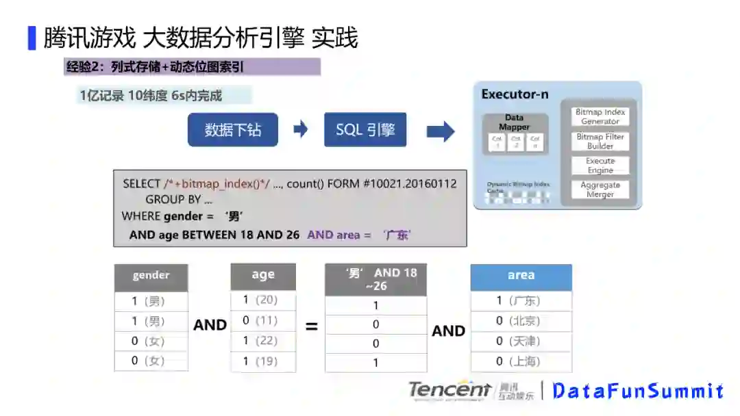 执行器执行的时候,主要是用到了列式存储和动态位图索引,比如前端筛选条件的时候,会生成一个sql,我们这个sql其实是计算男性,年纪再18到26岁间的广东用户,总结起来就是广东年轻靓仔,这里我们会解析这个sql,然后对这些条件进行按列 位图化计算,比如这里的男性标识为1女性标识为0,然后这里的年龄会根据条件对用户进行区分,比如18到26岁的,我们满足条件的标记为1,不满足条件的标记为0,同理区域也是这样,这样的话,如果要计算条件的组合就变成了位图的与操作了。速度会有很大的提升。