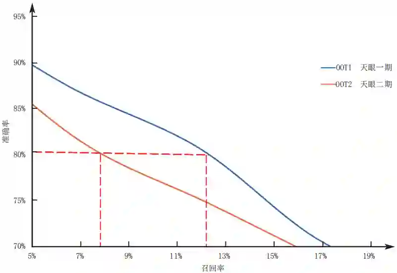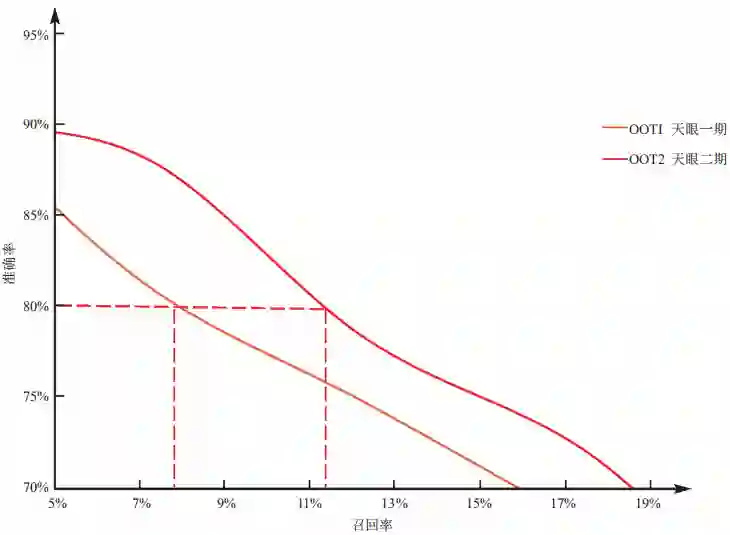 在天眼一期效果已经下降的 OOT2 中,天眼二期的召回率能在准确率为80%的情况下重新回到11.5%左右。