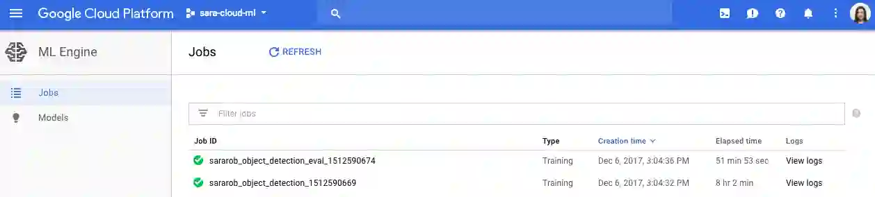 你可以通过在云端控制台导航到ML Engine的“作业”部分来验证您的任务是否正确运行,并检查日志以查找特定作业: