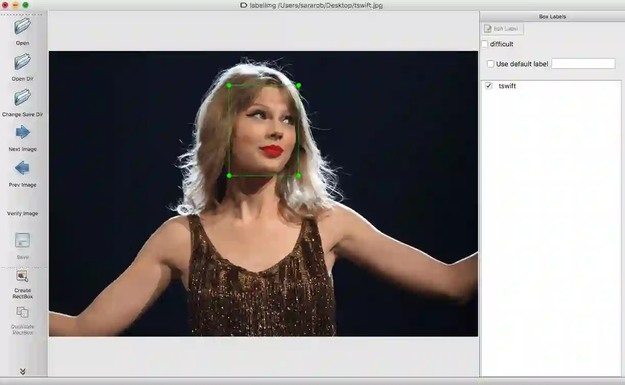 打边框工具依然使用LabelImg,这是一个基于Python的程序,你只需输入带标签的图像,它就会输出一个xml文件,将每张照片都打上边框同时还有相关标签(不到一上午我就处理好200张图片了)。下面是它如何工作的(标签输入为tswift):