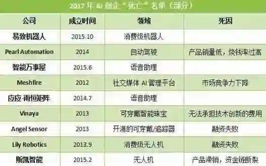 2017年一年,共有19家投身共享经济的企业宣布倒闭或终止服务,其中包括7家共享单车企业、2家共享汽车企业、7家共享充电宝企业、1家共享租衣企业、1家共享雨伞企业、1家共享睡眠仓企业。除了共享类的经济之外,传统经济的日子亦不好过,沃尔玛3个月连关11店;网易关闭一元夺宝;京东二手酷卖四个月哄然倒下;根据腾讯研究院和IT桔子联合发布《2017年中美人工智能创投现状与趋势研究报告》显示,截止上半年,中美AI公司已倒闭了50家。