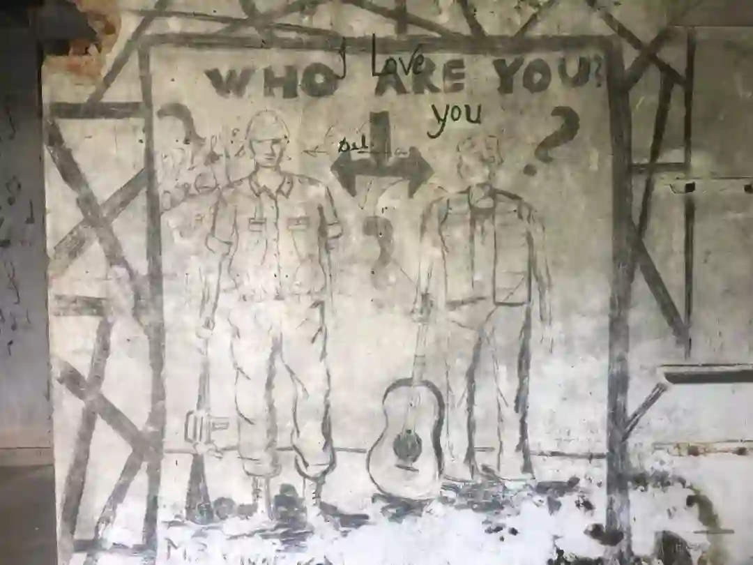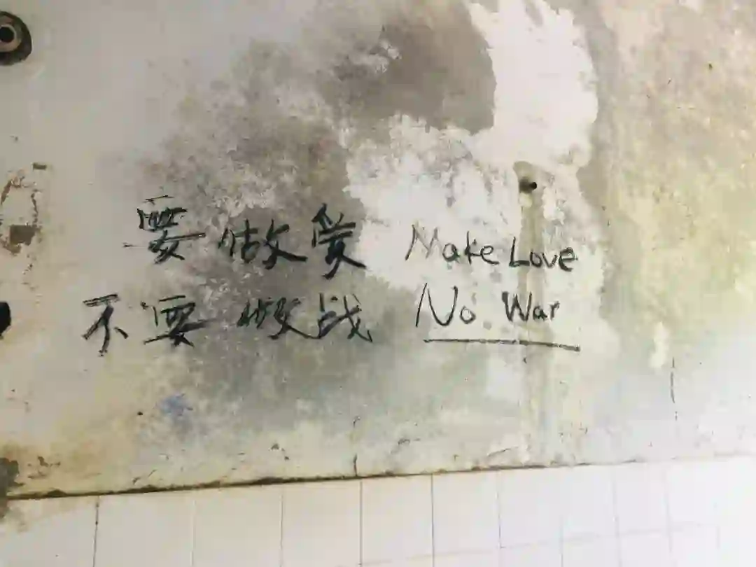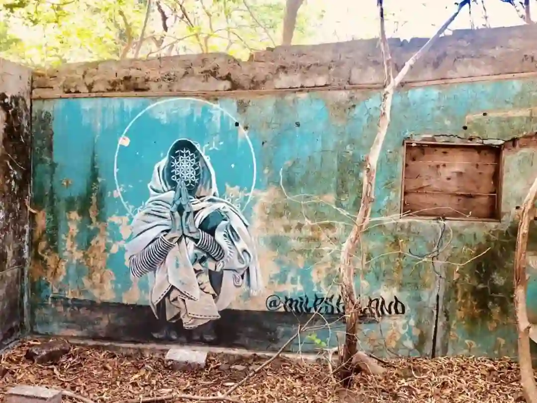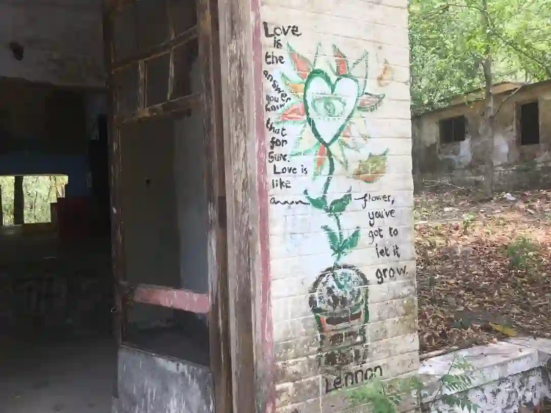 再往里走,大片的废墟掩在茂盛的草丛里,废墟墙壁斑驳,却被来自世界各地的朝圣者写满涂鸦,让人惊叹。两位年轻的印度小伙抱着吉他The Beatles的涂鸦前忘情歌唱,歌声在废墟中回荡。
