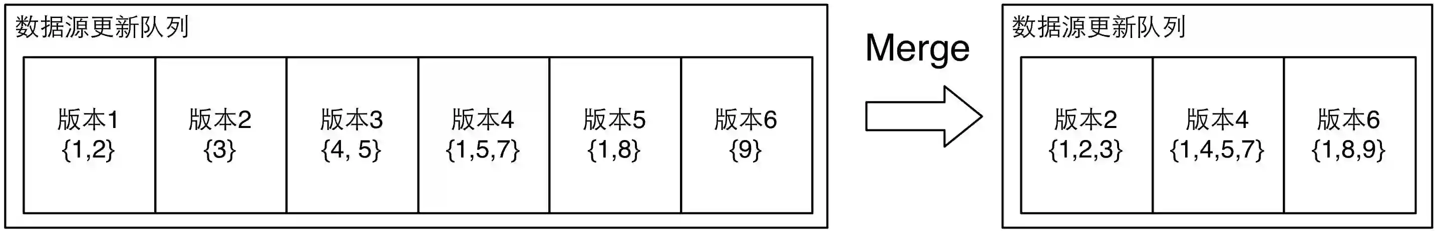 另一个问题则是更新队列的长度。如果不进行任何优化,更新队列理论上是无限长的,甚至会超过数据集的大小。一个优化方法是我们限制住更新队列的最大长度,一旦长度超过限制,则执行合并(Merge)操作。Merge操作将队列中的数据进行两两合并,合并后的版本号以较大的版本号为准,合并后的更新数据集是两个数据集的并。Merge后,新的队列长度下降为原更新队列的一半。