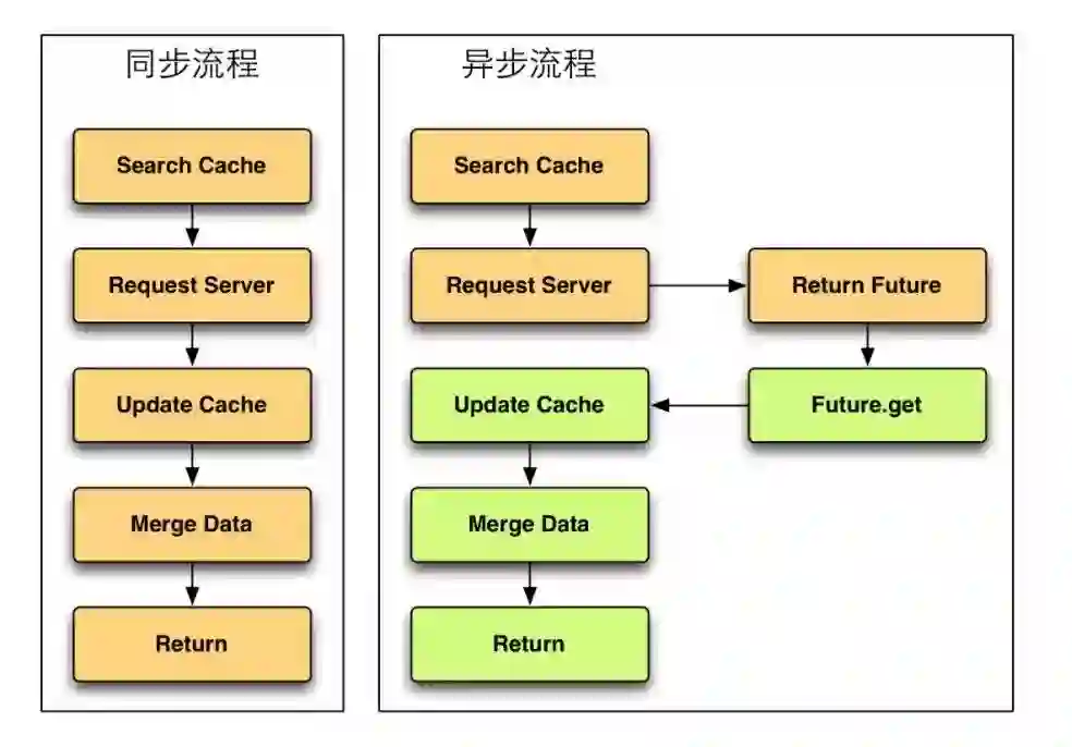 不同颜色的处理框表示不同的请求。异步流程需要使用方的两次请求才能获取到数据。像图中“用服务端数据更新缓存”(update cache)、“服务端数据与缓存数据汇总”(merge data)步骤在异步流程里是在第二次请求中完成的,区别于同步流程第一次请求就完成所有步骤。将数据流程拆分为这些子步骤,同步与异步只是这些步骤的不同顺序的组合。因此读写缓存(search cache、update cache)这两个步骤可以抽象出来,与其余逻辑解耦。