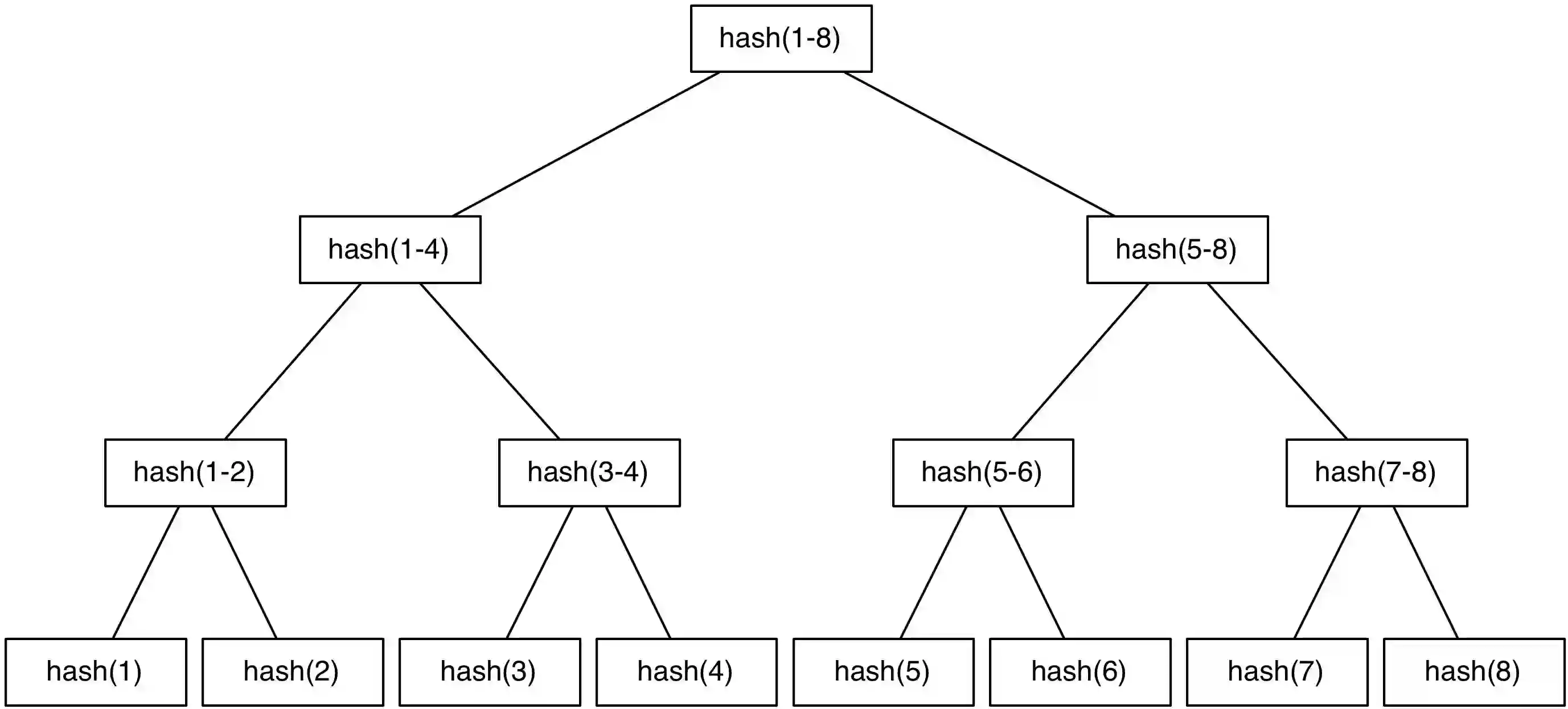 Merkle Tree同步算法走的是另一条路,简单来说就是通过每次直接比较两个数据集的差异来获取Diff。首先看一个最简单的算法:每次内存副本将所有数据的Hash值发送给数据源,数据源比较整个数据集,对于Hash值不同的数据执行同步操作——这样就精确计算出了两个数据集之间的Diff。但显而易见的问题,是每次传输所有数据的Hash值可能并不比多传几个数据轻松。Merkle Tree同步算法就是使用Merkle Tree数据结构来优化这一比较过程。