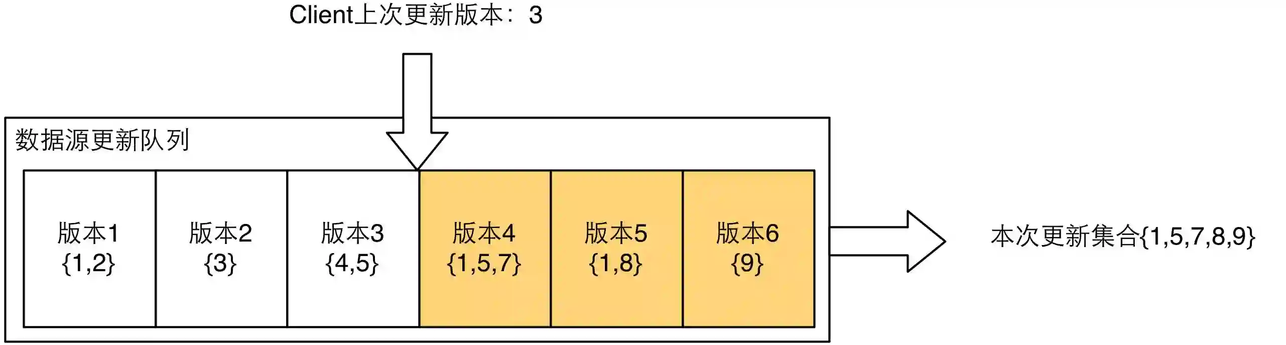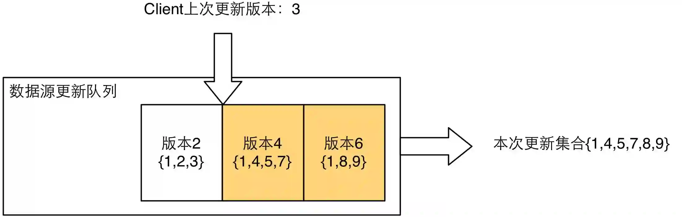 内存副本发起同步请求时,会携带该副本上一次完成同步时的最大版本号,这意味着所有该版本号之后的数据变化都需要被拉取过来。数据源方收到请求后,从更新队列中找到大于该版本号的所有数据变化,并将数据变化汇总,得到最终需要更新的Diff,返回给发起方。此时内存副本只需要更新这些Diff数据即可。