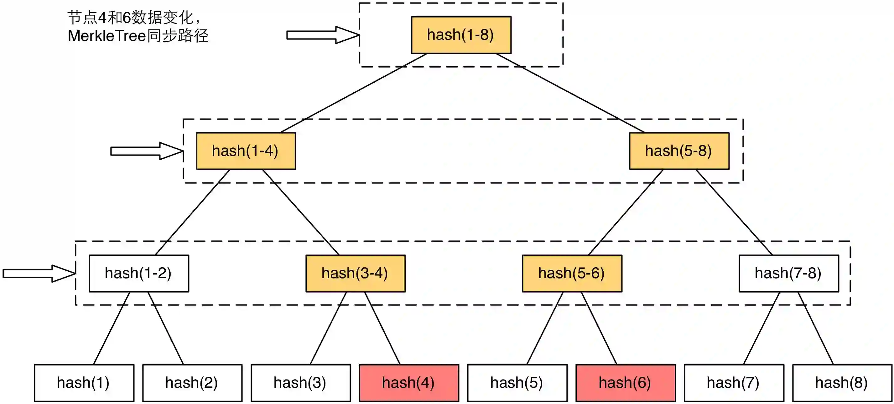 Merkle Tree同步协议由副本发起,将副本根节点值发送给数据源,若与数据源根节点hash值一致,则没有数据变动,同步完成。否则数据源将把根结点的所有儿子节点的hash发送给副本,进行递归比较。对于不同的hash值,一直持续获取直到叶子节点,就可以完全确定已经改变的数据。以二叉树为例,所有的数据同步最多经过LogN次交互完成。
