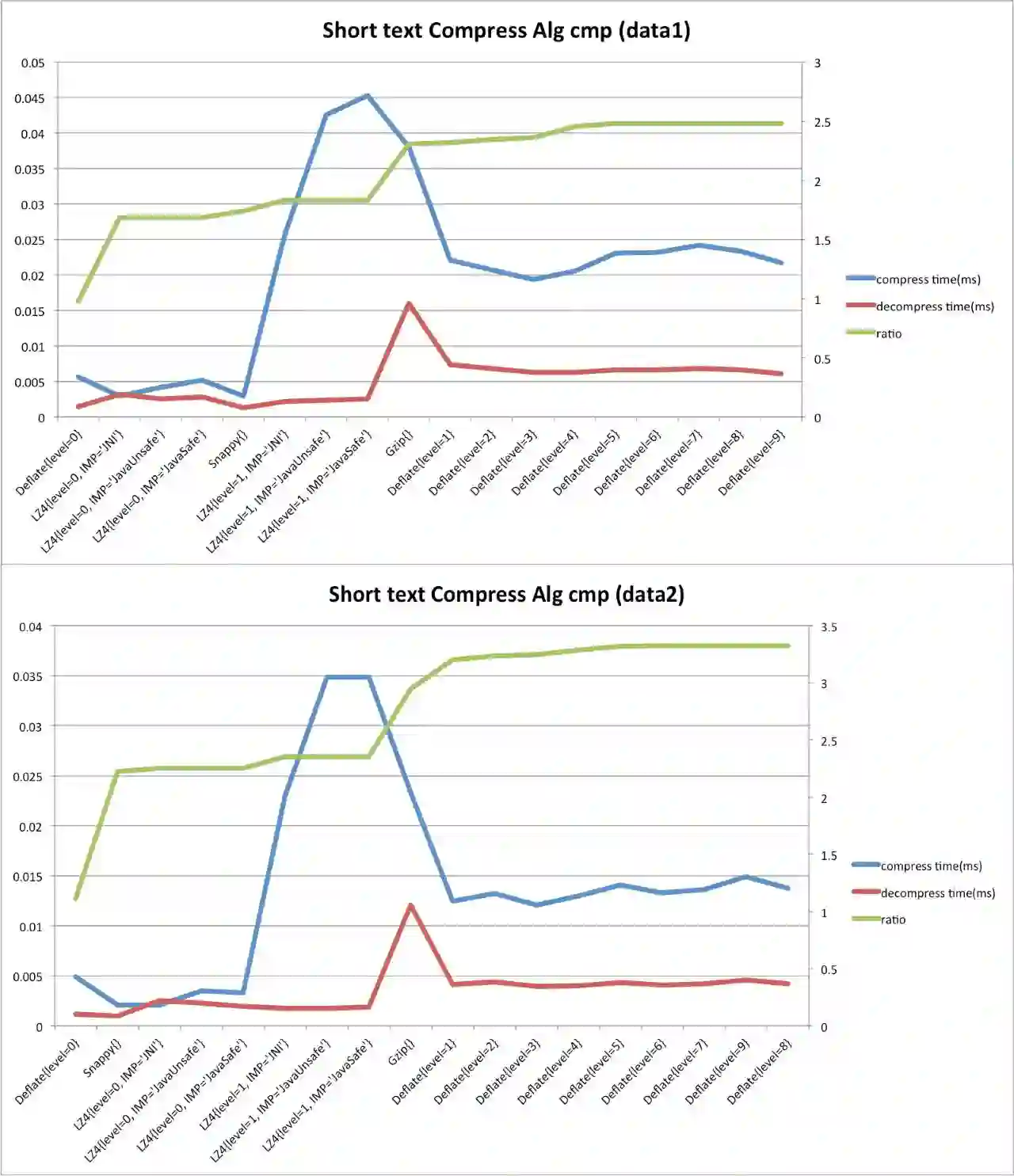 压缩算法:Deflate算法有1~9个压缩级别,级别越高,压缩比越大,操作所需要的时间也越长。而LZ4算法有两个压缩级别,我们用0,1表示。除此之外,LZ4有不同的实现版本:JNI、Java Unsafe、Java Safe,详细区别参考 https://github.com/lz4/lz4-java ,这里不做过多解释。