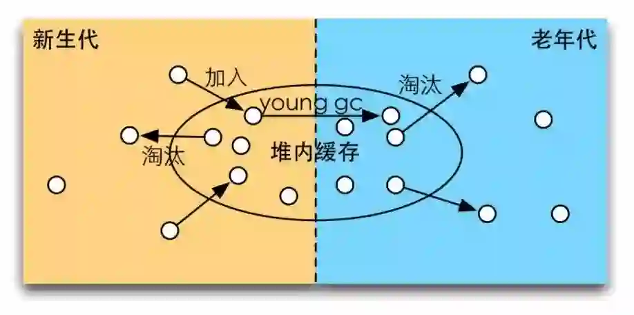 随着请求产生的数据会不断加入缓存,QPS较高的情形下,Young GC频繁发生,会不断促使缓存所占用的内存从新生代移向老年代。缓存被填满后开始采用Least Recently Used(LRU)算法淘汰,冷数据被踢出缓存,成为垃圾内存。然而不幸的是,由于频繁的Young GC,有很多冷数据进入了老年代,淘汰老年代的缓存,就会产生老年代的垃圾,从而引发Full GC。