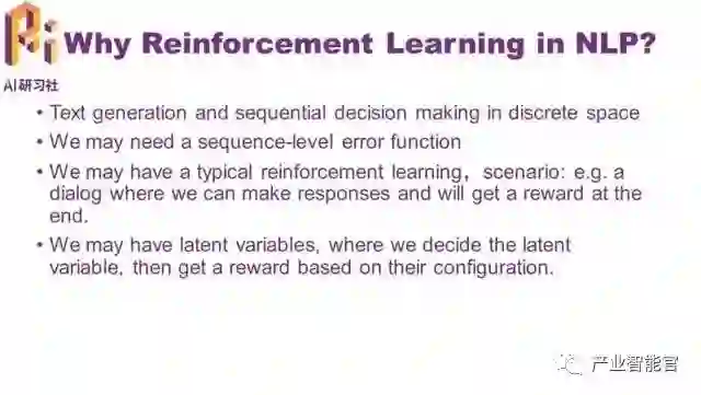 我认为,第一点最重要,就是强化学习在天然的离散空间上可以 work 的一个原因,因为目前的自然语言处理大多都是一个离散空间的自然语言处理、生成或者是序列决策,这时,我们很天然地可以利用到强化学习去拟合和运作。另外,它的决策函数是可以自己制定的一个过程,但这个制定复杂,不同的应用也有不同的方式。