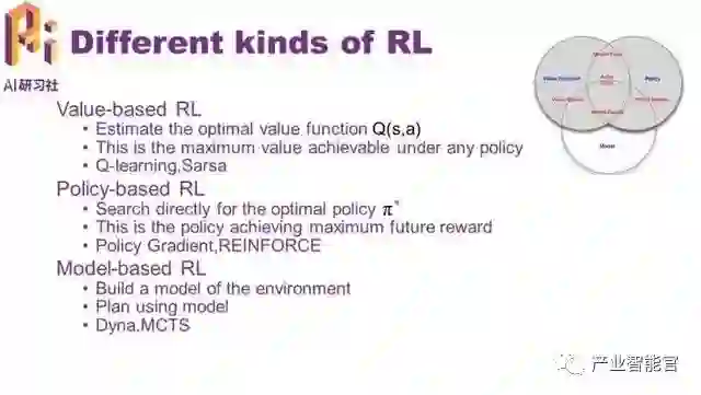 基于策略的强化学习,代表性的有策略梯度和 REINFORE 算法。另外,图(右上)可以看出它们是有交叉的,这些交叉可以是 AC 算法或比较高级的一些算法。