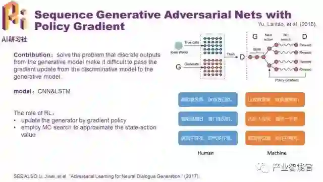 第一篇是 sequence generative adversarial nets with policy gradient,这是首篇用 GAN 在 NLP 上的应用,此前 GAN 不能应用文本生成和自然语言处理,这时,强化学习就起到了决定性的作用,这是至关重要的一部分,所以今天我们拿出来讲一下,而且 sequence 也比较出名和具有代表性,是强化学习在文本生成的一个应用。