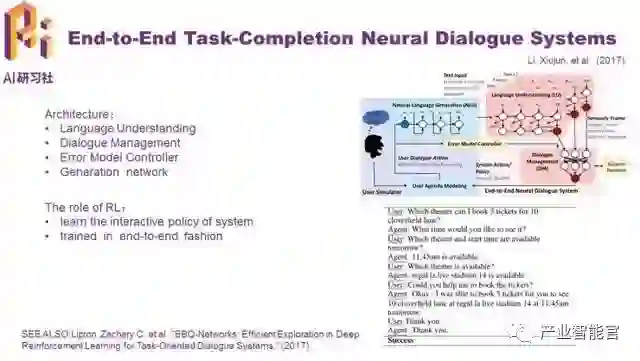 最后一篇的关于任务型对话方面的内容,强化学习最主要作用是运用强化学习去训练它的决策策略,根据刚才提到的例子,客服系统需要预测问问题,这就是一个决策,需要利用强化学习去做这个决策,Q-learning 也可以,但是效果比较差,还有就是 Q-learning 需要大量的样本,这时,用强化学习就可以减少大部分的样本,在很多应用上比较方便。