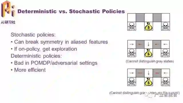 如果是随机性策略的话,会得到更多探索性。当是一个确定性的话,它会更加有效,但它会有一些问题,比如图(右)的例子,设定是需要拿到中间的钱,如果用确定性的 policies 的话(用 Q-learning 的算法去学习),最终学习到的是中间的状态。假设是每个格子只能了解两边的情况,灰色格子两边都是白色格子,agent 只能看到两边格子都是白色的。右边的灰色格子同理,只能看到两边是白色的,不能判断哪边更好哪边更坏。