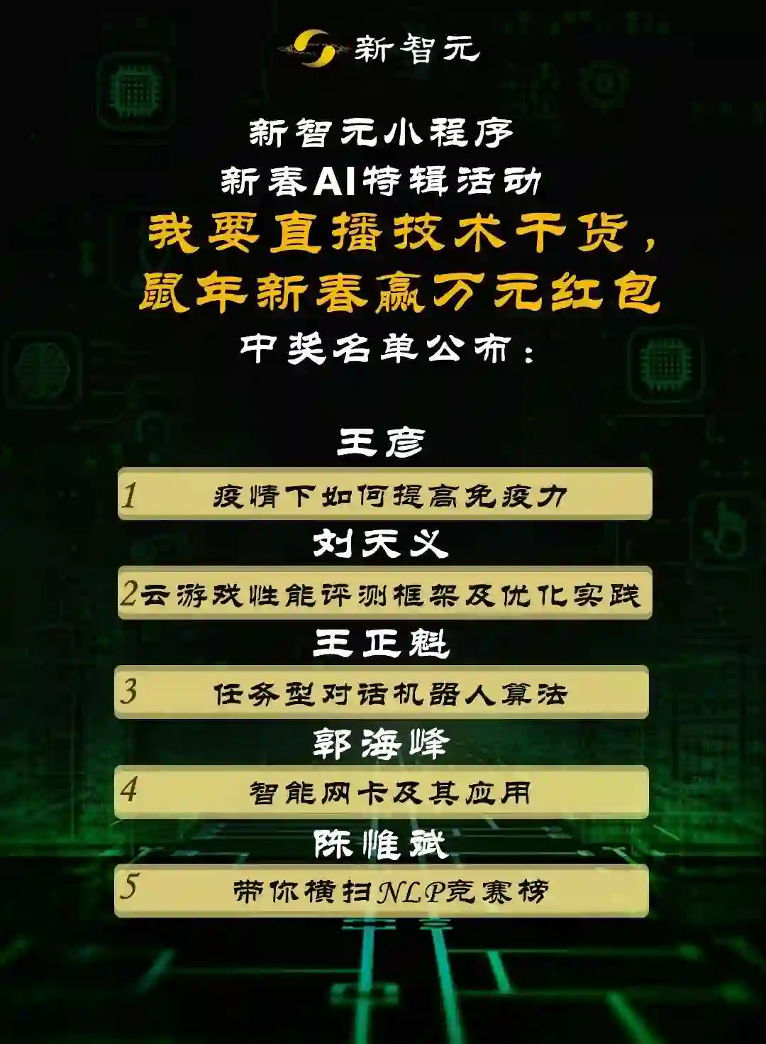 新智元小程序新春AI特辑活动#我要直播技术干货,鼠年新春赢万元红包#中奖名单公布,恭喜5位的优秀分享者!