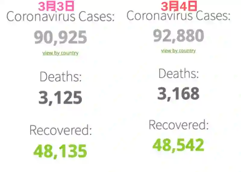 目前来看,虽然中国疫情蔓延的势头暂时有所减缓,但依旧不能掉以轻心,毕竟在全球范围,疫情才刚刚开始疯狂蔓延,仅仅一天时间确诊人数就激增了近2000人。下图分别是3月3日10点左右和3月4日9点左右得到的统计数据: