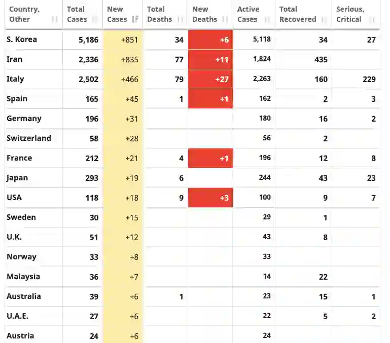 韩国和伊朗成为新冠肺炎激增最严重国家,意大利紧随其后。
