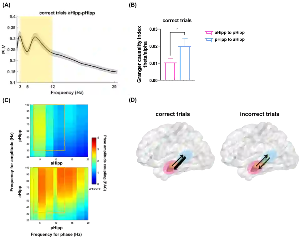 研究发现,在工作记忆维持期间海马体前后亚区低频神经振荡活动显著升高,说明海马体前后亚区均参与了工作记忆认知过程。在3-12Hz频段,海马体前后亚区之间相位同步活动增加,而且在该频段内后海马驱动前海马完成神经信息传递,后海马在该频段的相位与前海马的高频幅值存在显著耦合的关系。这些现象在错误加工工作记忆时消失。以上结果说明海马体前后亚区通过特定的神经信息传递方向以支持正确的工作记忆加工。