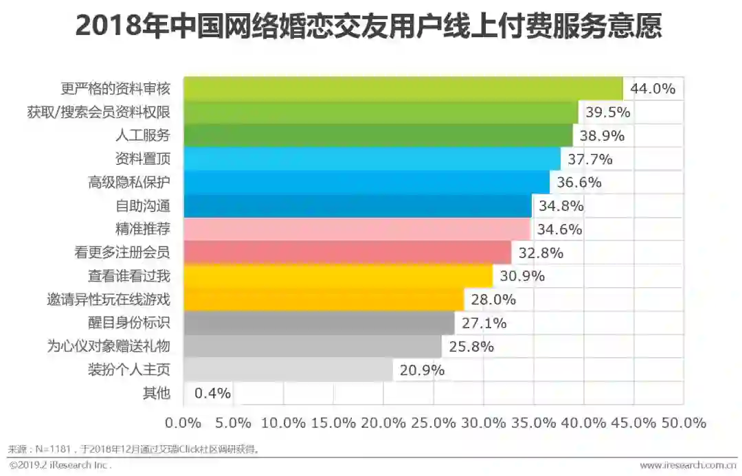 根据艾瑞调研显示,用户在付费服务中付费意愿最高的为“更严格的资格审核”占比达到44.0%,说明现阶段安全性仍是用户最关心的问题之一,此外“获取/搜索会员资料权限”、“人工服务”、“资料置顶”和“高级隐私保护”等增值服务功能改善也更能促使用户付费。