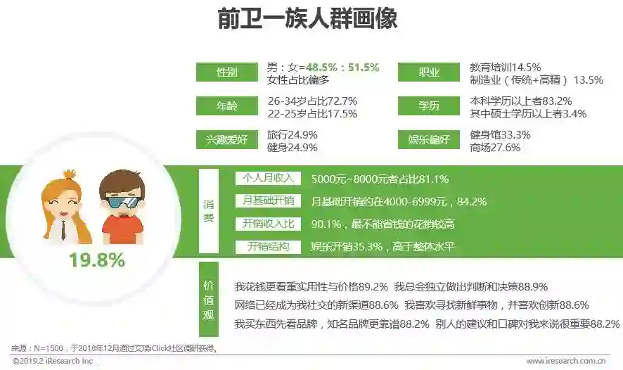 前卫一族:女性占比偏多,收入一般但花销较高,追求个性时尚,喜欢新鲜事物,喜欢名牌产品