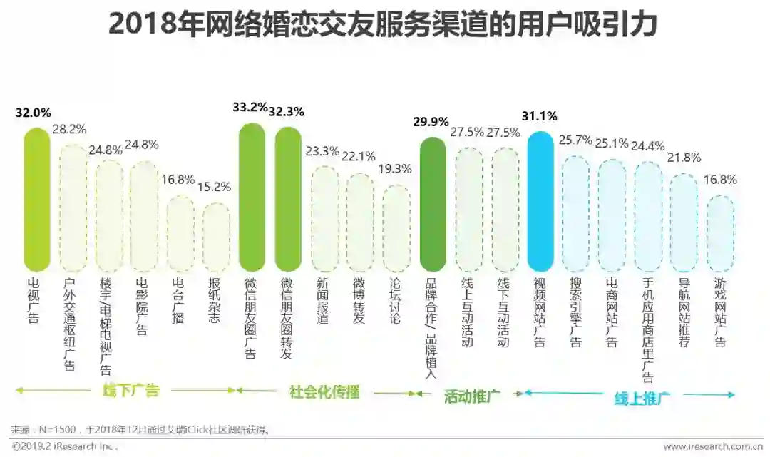 根据艾瑞调研显示,对于网络婚恋交友用户来说,社会化传播渠道中的朋友圈广告和转发是最具有吸引力的信息渠道;另外,具有庞大受众群体的传统电视广告、在PC时代慢慢兴起的视频网站广告、以及与其他品牌合作/品牌植入,均对用户有较强吸引力。